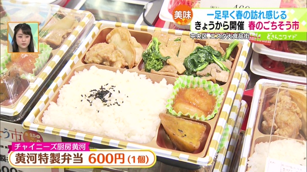 ●チャイニーズ厨房黄河「黄河特製弁当」600円(1個)本格的な中華料理が並ぶ中、春を感じるお弁当をご紹介しました。春を代表する食材・菜の花と竹の子などをXO醤で炒めた野菜炒めが入っています。