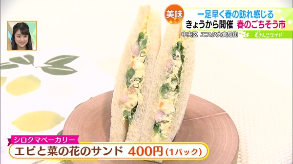 ●シロクマベーカリー「エビと菜の花のサンド」400円(1パック)今日から「エビと菜の花のサンド」が登場しました。エビと菜の花が入った卵サラダをサンドしています。