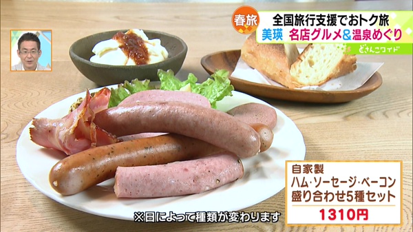 隣のレストランで試食ができます。人気の「5種セット」をいただきました。この日はハム2種類とソーセージ2種類、売れ筋商品のベーコン、幅広い年代に人気のチーズ入りソーセージをオススメしてもらいました。
