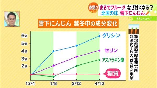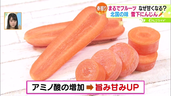 雪下にんじんは、なぜ甘くて美味しくなるのか。でんぷんが糖に変わる“越冬じゃがいも”とは違い、雪下にんじんはアミノ酸が大きく関わっていることが分かっています。