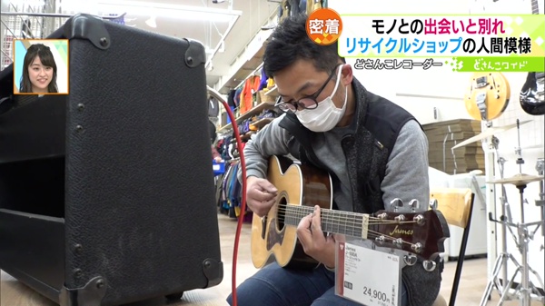 お店には、たくさんの中古ギターが並んでいます。その売り場でギターを弾いている男性に出会いました。