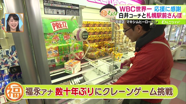 白井コーチが食べたいお菓子をゲットするため、クレーンゲームに挑戦する福永アナ -