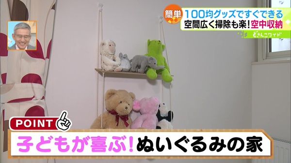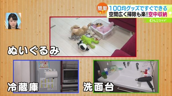 齊藤さんが片付けに悩む「ぬいぐるみ」「冷蔵庫」「洗面台」収納のプロ・川村さんに、100円ショップ「Seria(セリア)」のグッズを使った“空中収納”を教えていただきました。