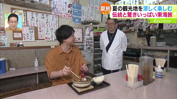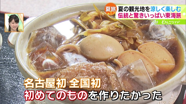 夏の名物メニューは「冷し味噌煮込みうどん」。湯気は立たず、氷が浮いていて、開発になんと5年もかけたこだわりのメニューです。