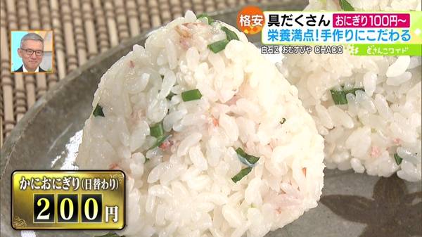 ●かにおにぎり(日替わり) 200円取材した日の日替わりは、現在市場に安く出回っているオオズワイガニをたっぷり使ったおにぎりでした。
