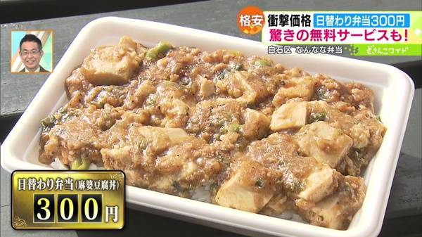 ●日替わり弁当(麻婆豆腐丼)300円 ※みそ汁無料サービス日替わりは他に、ヤンニョムチキン弁当、とんかつ弁当、ハンバーグ弁当なども登場しています。