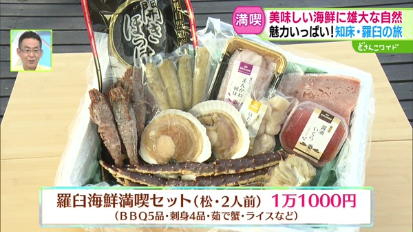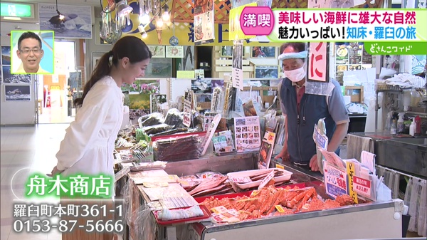 今の羅臼の旬は、つぶ貝や時鮭、ホッケなど。羅臼で獲れたイバラガニや大きなタコも並んでいます。