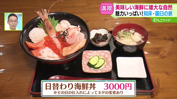 羅臼で水揚げされた旬の魚を中心に、新鮮な魚介類を使った料理を楽しめるお店。オススメは「日替わり海鮮丼」です。