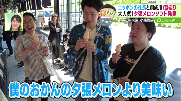 ●夕張メロンソフトクリーム 450円人気商品「夕張メロンソフトクリーム」の食レポをする辻さん(写真中央)