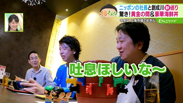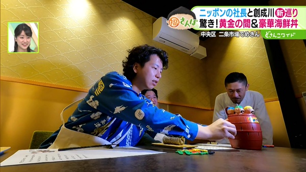 でめきんの市川暁久社長(写真右)と海鮮丼をかけて黒ひげ危機一発ゲームで対決! -