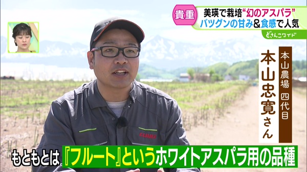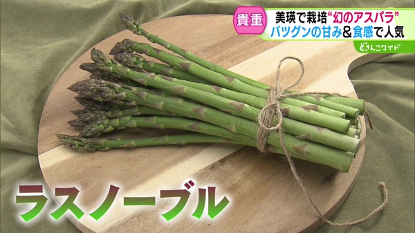 続いてご紹介するのは、美瑛町でしか作られていない美しいグリーンアスパラ“ラスノーブル”。2008年の洞爺湖サミットでは各国首脳たちの晩餐会のお皿にも載りました。その希少性から幻のアスパラとも呼ばれています。