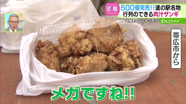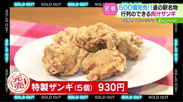 こちらの完売グルメは、大きなサイズが5個入った「特製ザンギ」。12個入ったボリューム満点の「メガ盛りっ!!」もあります。