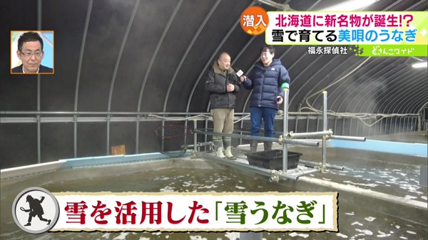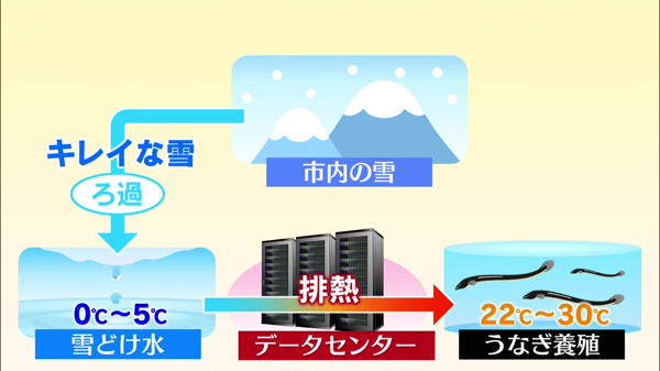 雪屋媚山商店の本間さんは、全国のコンピューターの情報を処理・保存するデータセンター事業も行っていて、雪解け水をコンピューターの排熱で温め、水温をウナギの養殖に最適な22〜30℃にしています。