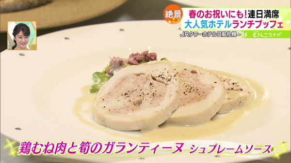 目の前で調理したての料理を提供する「ライブキッチン」。今月のオススメは、「鶏むね肉と筍のガランティーヌ・シュプレームソース」です。