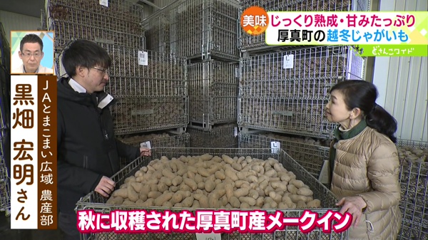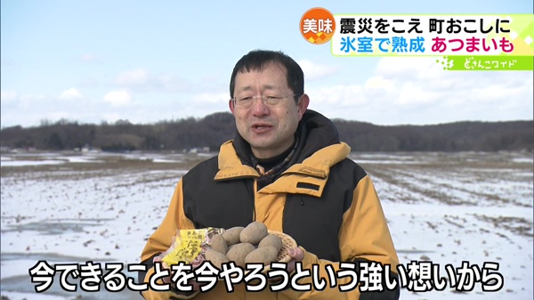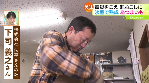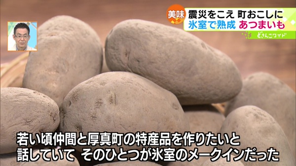 町が誇る氷室メークインをもっと知ってもらおうと取り組んでいる方がいます。厚真町うまれの下司義之さんです。“氷室熟成あつまいも”というブランド名をつけ、イモの仲卸・小売りと加工品の開発をする会社を5年前に立ち上げました。