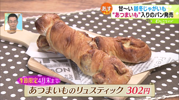 明日3/28(木)から、氷室熟成あつまいもを使用したパンを販売します。季節の味として4月末までの期間限定。塩をきかせた甘いあつまいもの存在感がある大人の味のパンです。