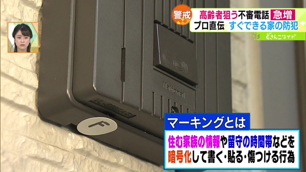 「マーキング」という手口があります。のぞき込まないと分からないような場所に、泥棒が暗号を書いていることがあります。ターゲットの家の情報を仲間内で共有し、犯行の目安にしているということです。