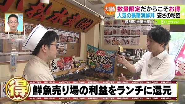 安さの秘密はまだありました。こちらは水産会社の直営店ということで、鮮魚の販売も行っています。この販売利益をお客さんに還元する形で、お得な海鮮丼を提供しています。