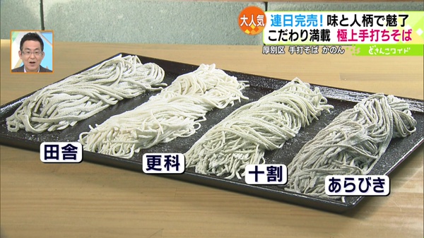 提供できる数には限りがあり、この日は50食程。そば粉は色々な味や香りを楽しんでほしいと、田舎・更科・十割・あらびきの4種類を作っています。中でも「十割」は1日10食限定。食通の常連客たちに大好評で、すぐに売り切れます。
