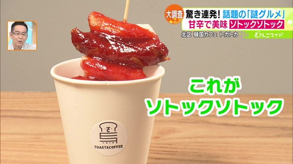 「ソトックソトック」とは、ソーセージとお餅が交互に串に刺さった韓国発祥のおやつ。これを油で揚げて甘辛いソースをかけています。