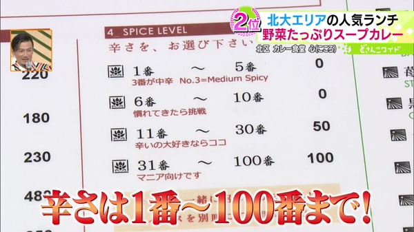 スープカレーの辛さは、なんと1〜100番まで選べます。今回はお店オススメの3番にしました。