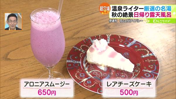 ●アロニアスムージー 650円 / ●レアチーズケーキ 500円チーズケーキの上にはアロニアがブレンドされた赤いはちみつがかかっています。
