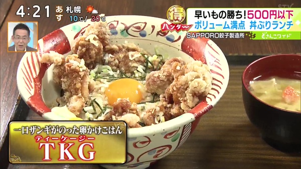 ●TKG 450円 ※限定5食500円以下!卵かけごはんの上に、餃子と並ぶお店の看板メニュー・ザンギが6個ものったボリュームたっぷりの一品。すぐ売り切れる大人気ランチです。