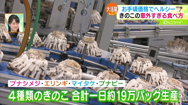 この工場では4種類のきのこ、一日合計19万パックを商品化。森を再現した温度と湿度管理の中で大切に育てられています。