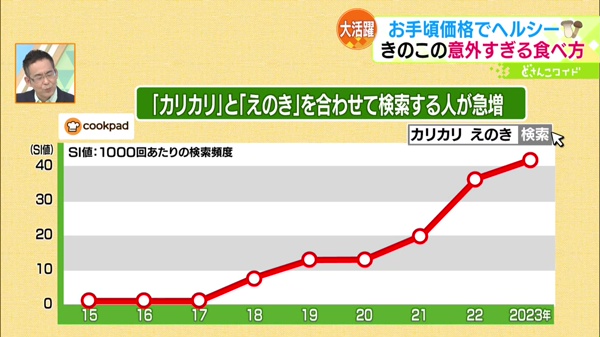 料理レシピ検索サービス「クックパッド」では、今“カリカリ”と“えのき”を組み合わせて検索する人が急増しています。