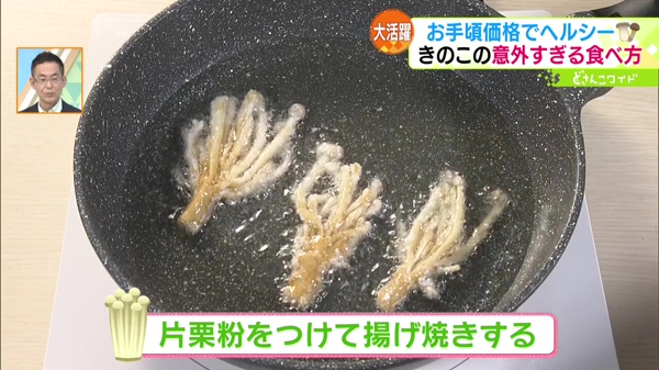 作り方は簡単。小分けにしたえのきたけに好みの味付けをして片栗粉をまぶして、フライパンの多めの油で揚げ焼きするだけです。