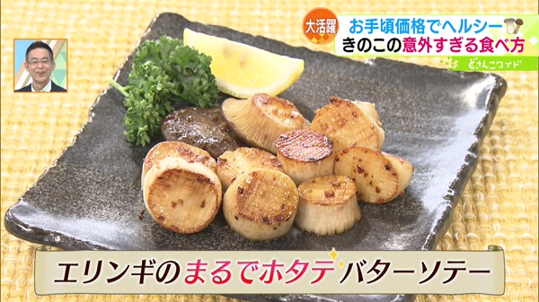 エリンギを“輪切りにしたホタテ風”にします。これをバターソテーにすると「エリンギのまるでホタテバターソテー」のできあがりです。