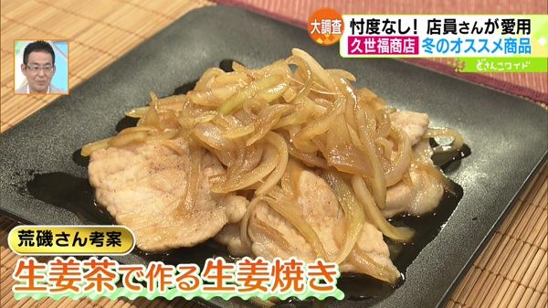 ●国産生姜を使った 生姜茶 949円伝説の店員・荒磯さんのベストバイ。お湯を入れるだけで簡単に作れる人気商品です。荒磯さんは「豚の生姜焼き」が作れると言います。 -