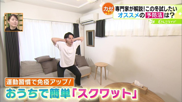 冬でもできるオススメの運動は“スクワット”。筋肉量の多い下肢を使うことで免疫力アップにつながります。