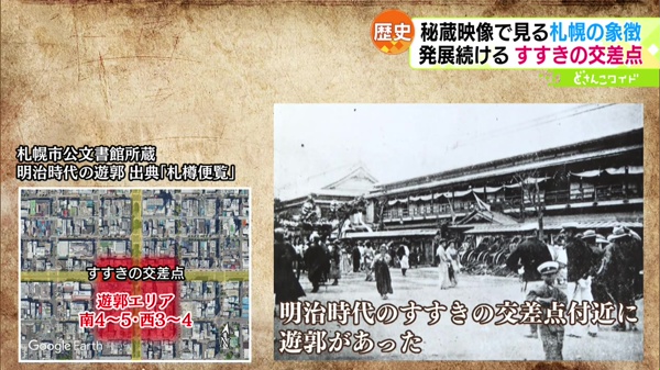まずは、150年以上前のすすきの交差点付近。札幌開拓のために本州からやってきた職人たちの足止め策として作られた飲み屋街が、“すすきの”の始まりでした。