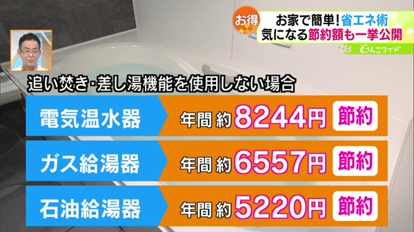 続いては、浴室での省エネ。家族でお風呂に入るタイミングを合わせると、追い焚きなどを使用せずに済むので節約になります。