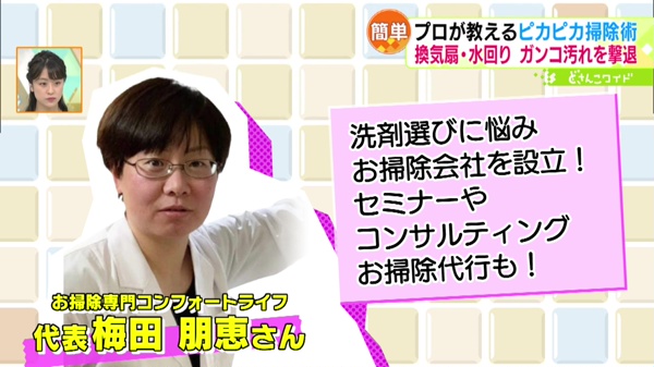 掃除を教えてくれるのは、洗剤選びに悩んだ末に掃除の会社まで設立してしまったという梅田朋恵さん。今回は洗剤選びに悩む高橋奈美さんのお宅にお邪魔し、プロの技を教えていただきます。