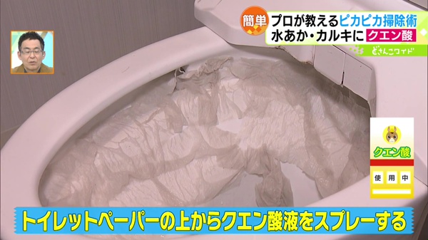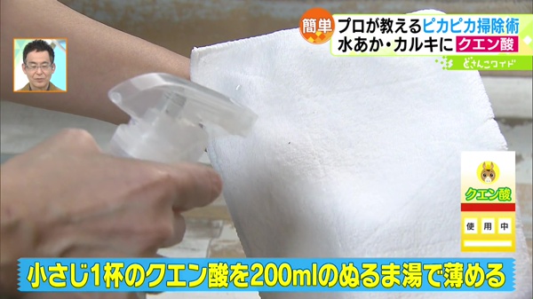 水回りの掃除は基本、小さじ1杯のクエン酸を200mlの水に溶かし、雑巾やスポンジでこするだけ。頑固な汚れには“つけ置き”がオススメです。