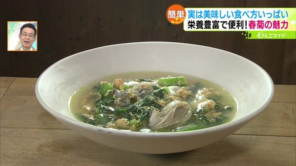 春菊とカキとかき卵のスープ※詳しい作り方は動画本編をご覧ください。