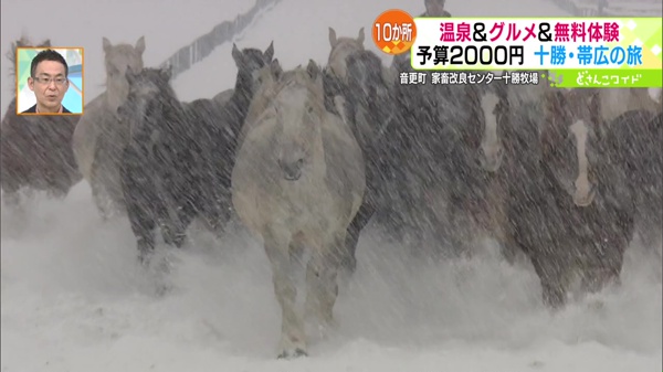 十勝牧場では冬場の運動不足解消、そして妊娠していた馬の安産のために走らせ、無料で一般公開をしています。今では冬の風物詩に。馬追運動は2月22日(木)まで、平日の9:30〜10:30をめどに公開しています。