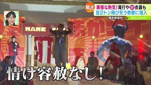 豆をぶつけられる側の鬼は、事前の募集で10組がエントリーしています。豆をぶつけたくて仕方がない700名ほどが会場に集まり、合図と共に豆を投げ出すと異様な盛り上がりを見せます。