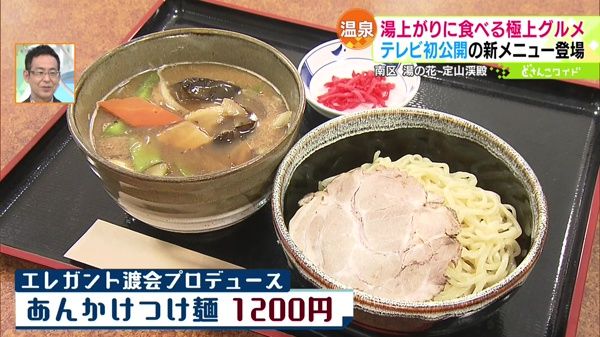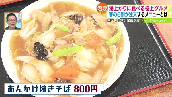 湯上がりメシは、お客さんの6割が頼むという「あんかけ焼きそば」や、渡会さんがプロデュースした「あんかけつけ麺」などをご紹介しました。