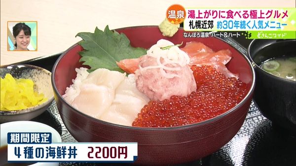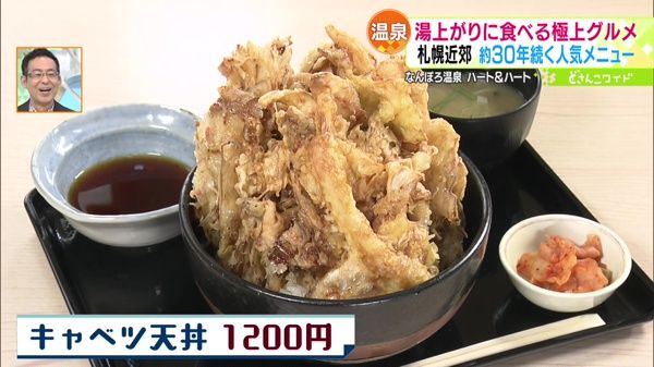湯上がりメシには、約30年続く名物メニュー「キャベツ天丼」や、期間限定でお得になっている海鮮丼などをご紹介しました。