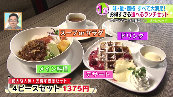 ランチはセットメニューがお得すぎるという声が多く、メイン料理、デザート、ドリンクなど、4品を自由に組み合わせることができます。