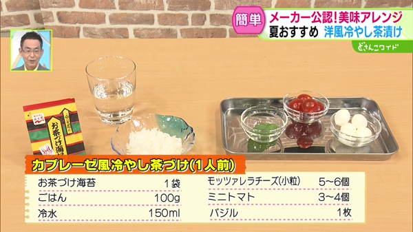 カプレーゼの材料とお茶づけの素とごはん、水を用意するだけで簡単に作れます。