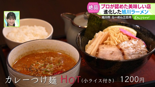 旭川ラーメンでは珍しいつけ麺も不動の人気です。麺は冷やした中太麺。スパイスを利かせたスープカレータイプのつけ汁でいただきます。暑い日に食べたくなる一品です。