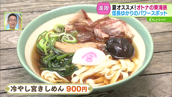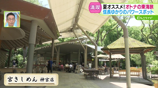 熱田神宮の境内には、名古屋めしをいただける休憩スポットもありました。幅広の平らな麺が特徴の「きしめん」。この時期はつるっと、のど越しの良い「冷やし宮きしめん」がオススメです。