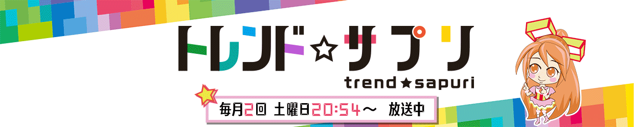 番組情報 放送時間土曜日20:54〜に放送(不定期) 番組紹介 「トレンド☆サプリ」は、土曜日20:54〜に放送(不定期)。 いつもの暮らしに、ほんの小さなトキメキを!最新トレンドをいち早くご紹介するミニ番組です。 明日のトレンドは?最新の放送は、YouTubeでチェック!